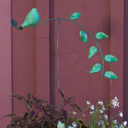 Handcrafted yard art features a cool little bird balanced by graceful leaves. In the gentlest of breezes, she gracefully rocks, adding life to any setting. Elements taken from nature are used to create unusual art that blends with and complements the garden. Earthy hues, available in spice or teal.